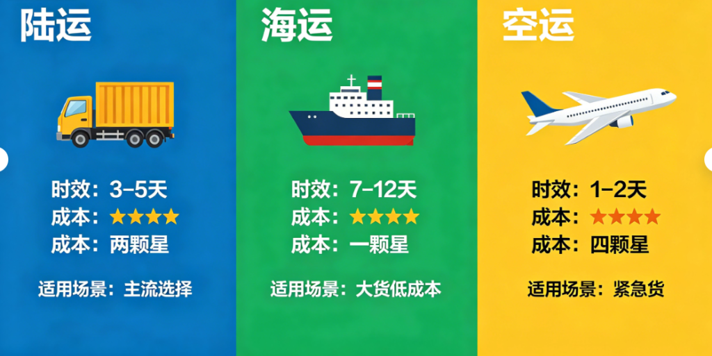 | 运输方式 | 时效 | 成本 | 适用场景 |